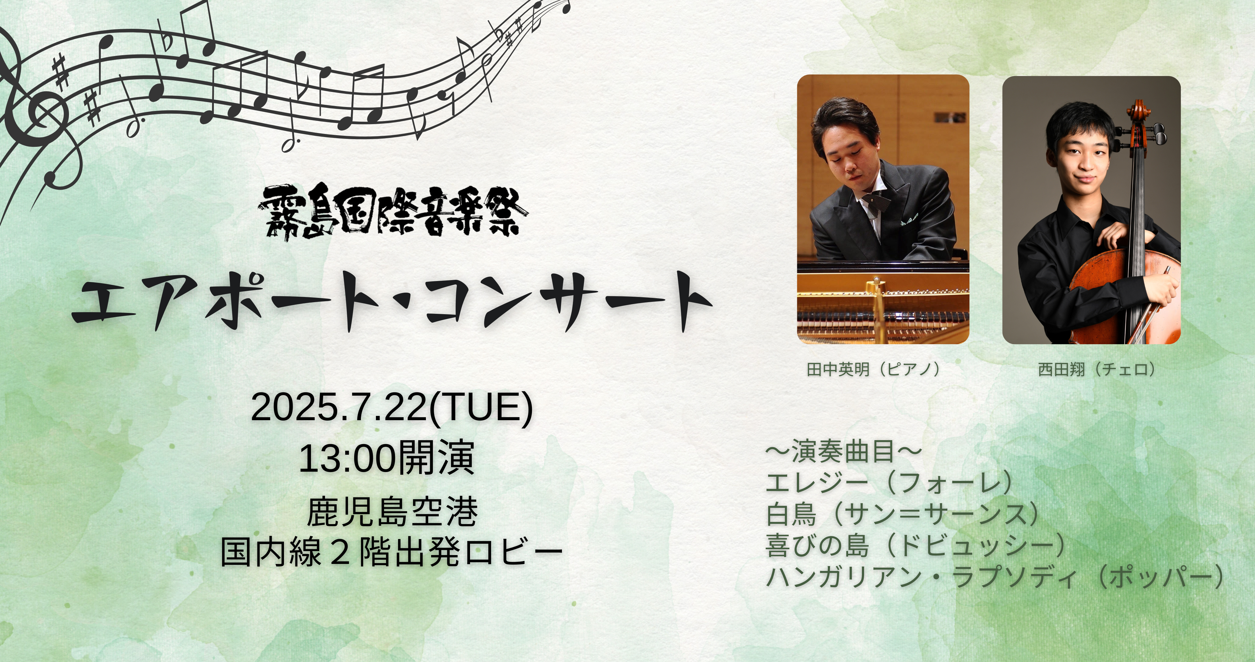 その一環として、鹿児島空港で『エアポート・コンサート』を開催いたします。ピアノとチェロの素敵な音色をお楽しみください。